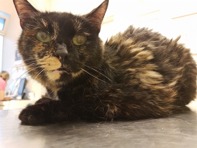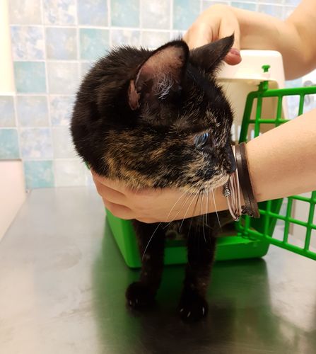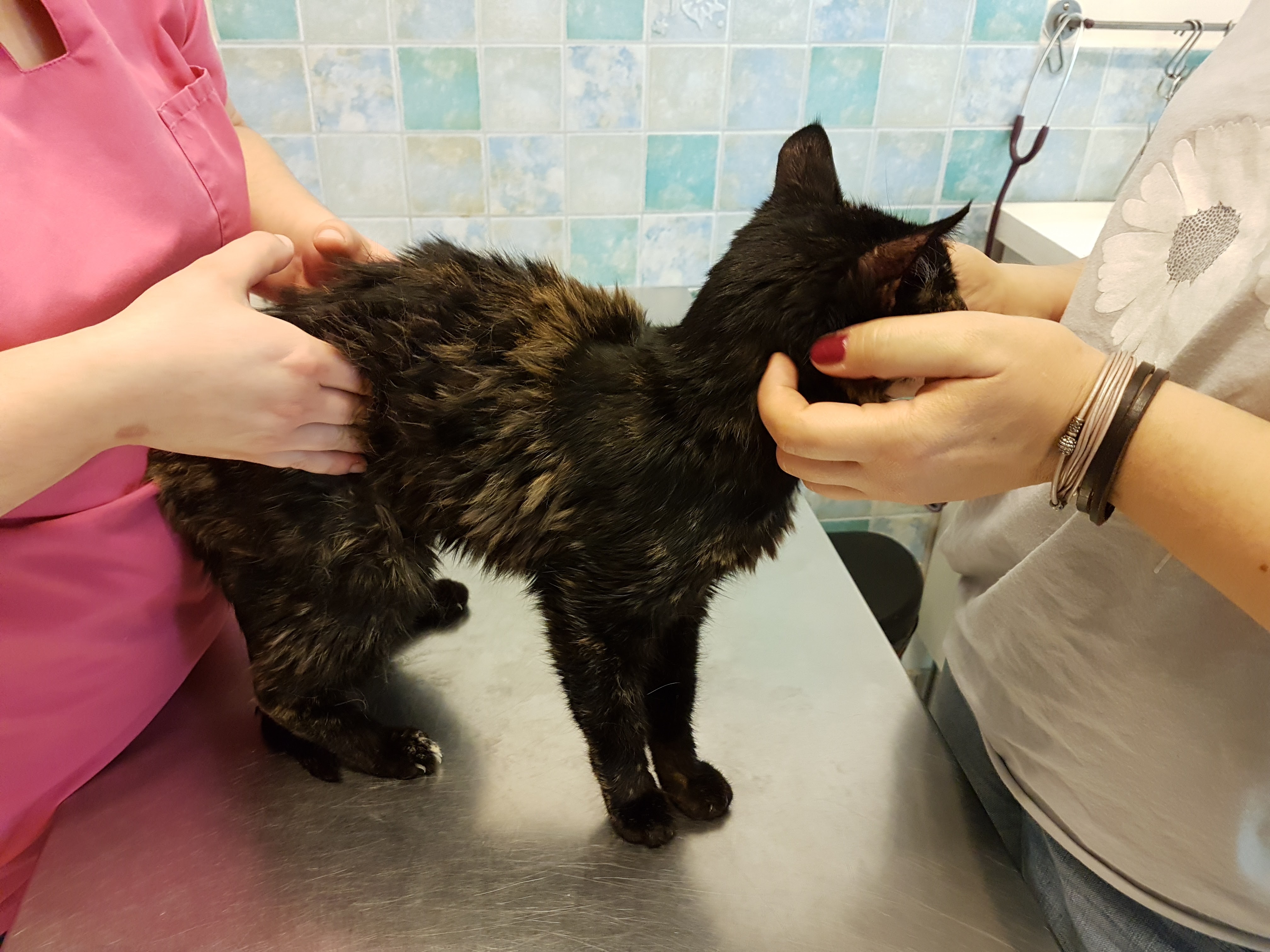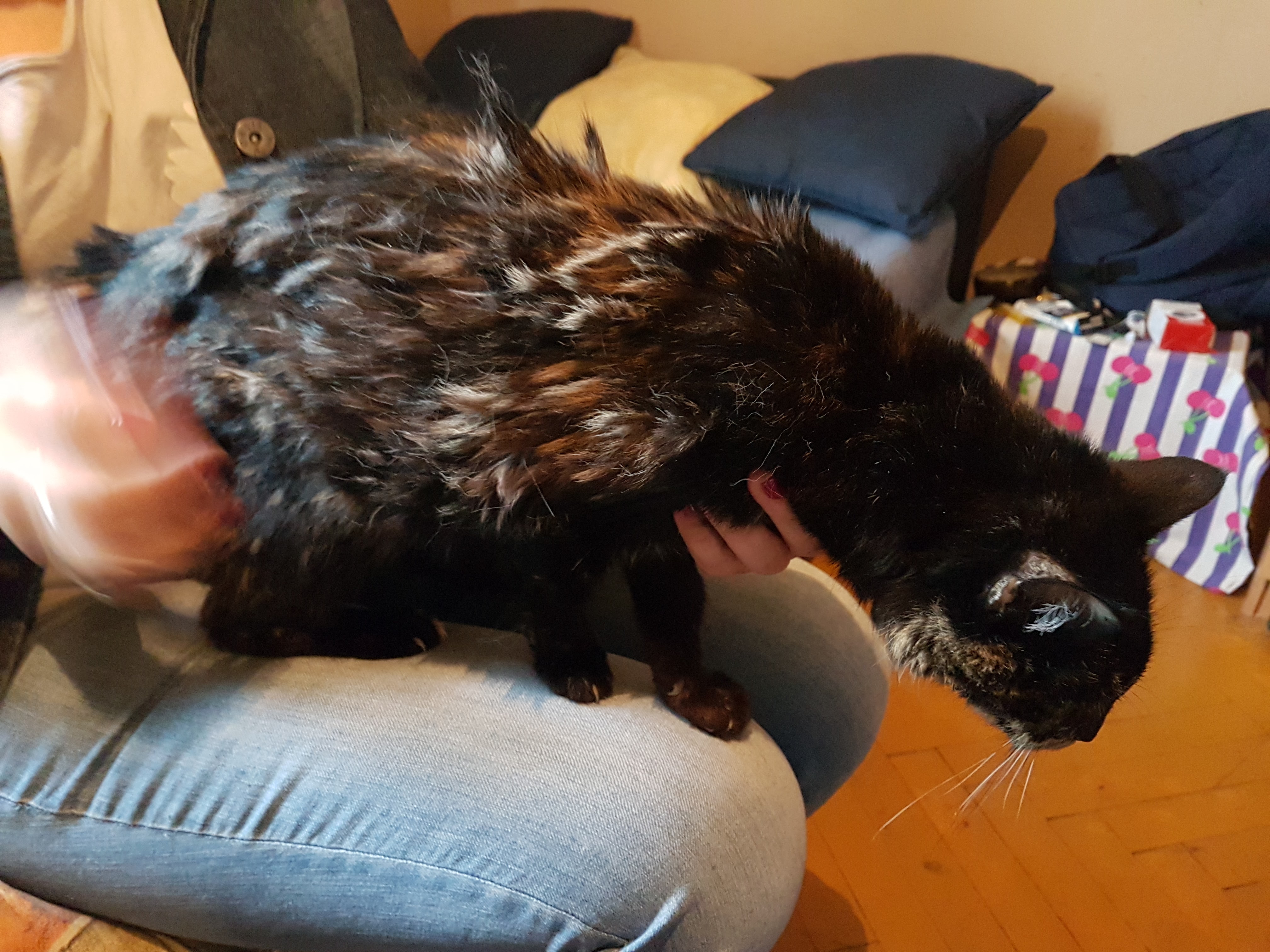 Kicia Kocia jest starą kotką. Jak starą? Raz Pani Ula mówi, że kotka ma już 20 lat, innym razem, że 5… Kicia Kocia dwa lata temu miała już operację usunięcia guzów nowotworowych z listwy mlecznej. Miała też wtedy usuniętą część zębów. Wtedy pomogła sąsiadka. Dziś już nie mogła, ale dała opiekunce telefon do nas. I dobrze. Bo stan Kici Koci jest tragiczny.